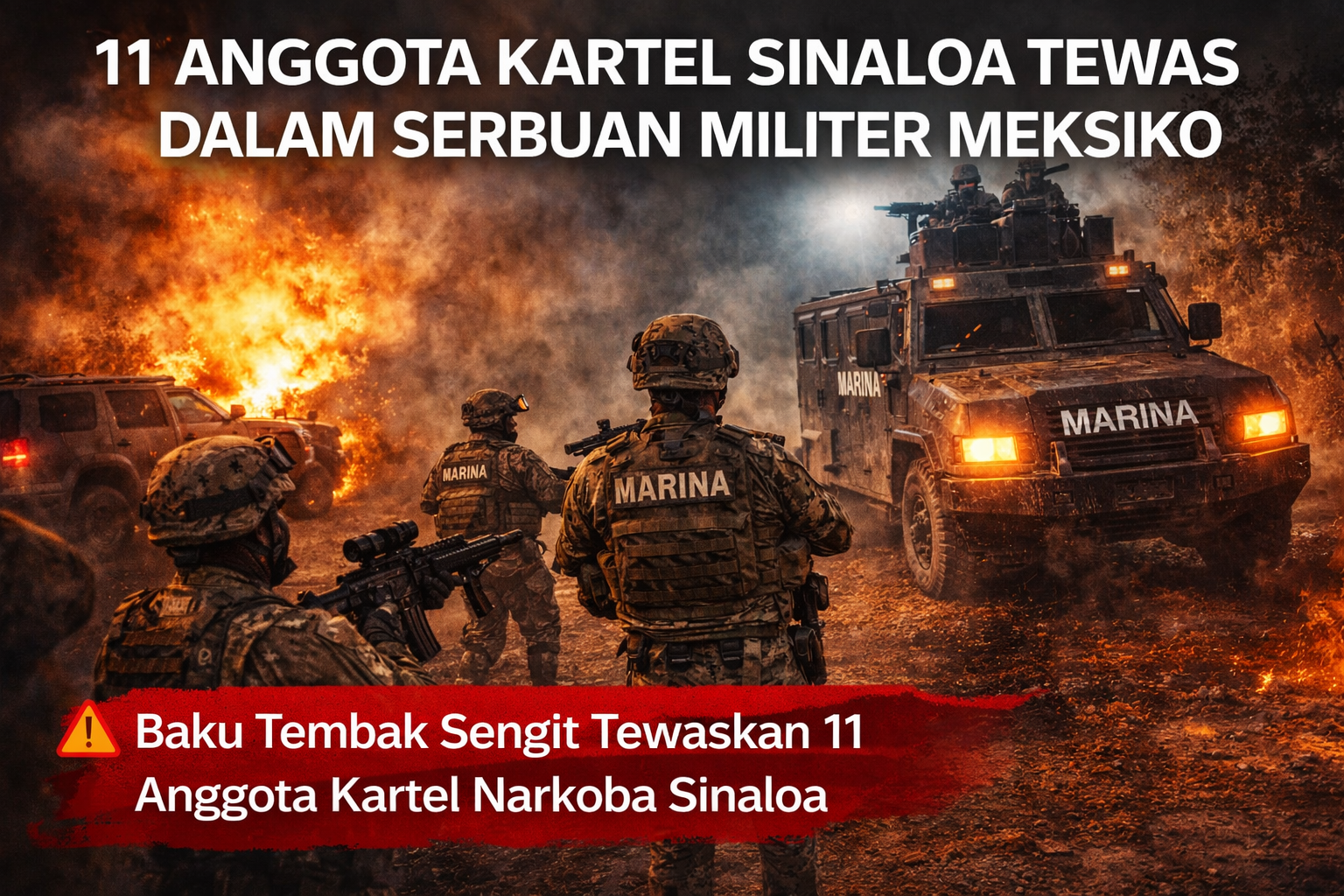 Jakarta (kitainfoin.com) – Pasukan militer Meksiko melancarkan operasi besar-besaran yang menargetkan markas kartel narkoba di wilayah barat laut Meksiko. Dalam operasi tersebut, sebanyak 11 anggota kartel Sinaloa dilaporkan tewas setelah terjadi baku tembak sengit dengan aparat keamanan.